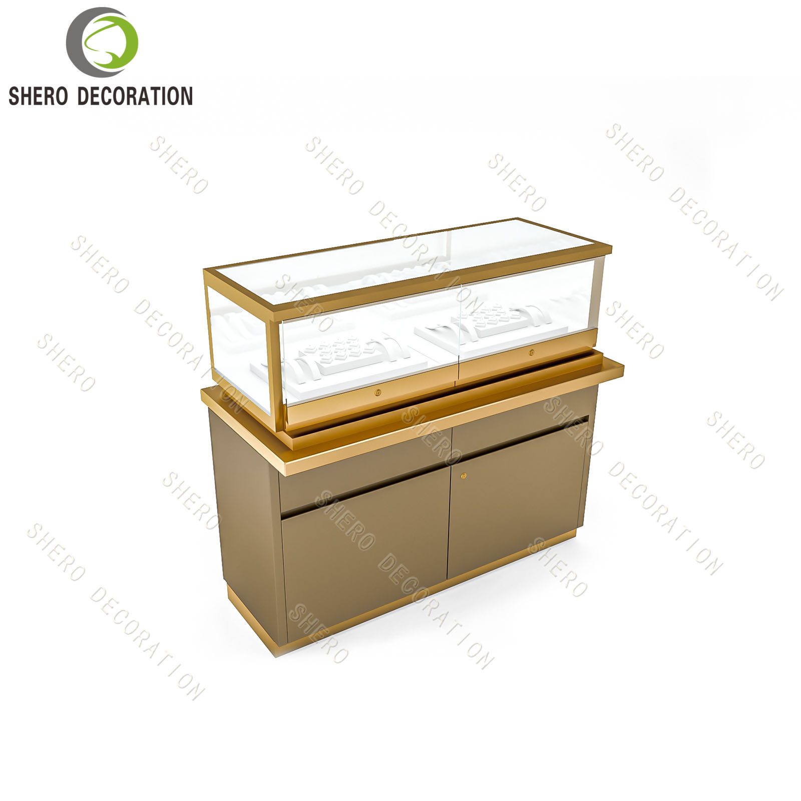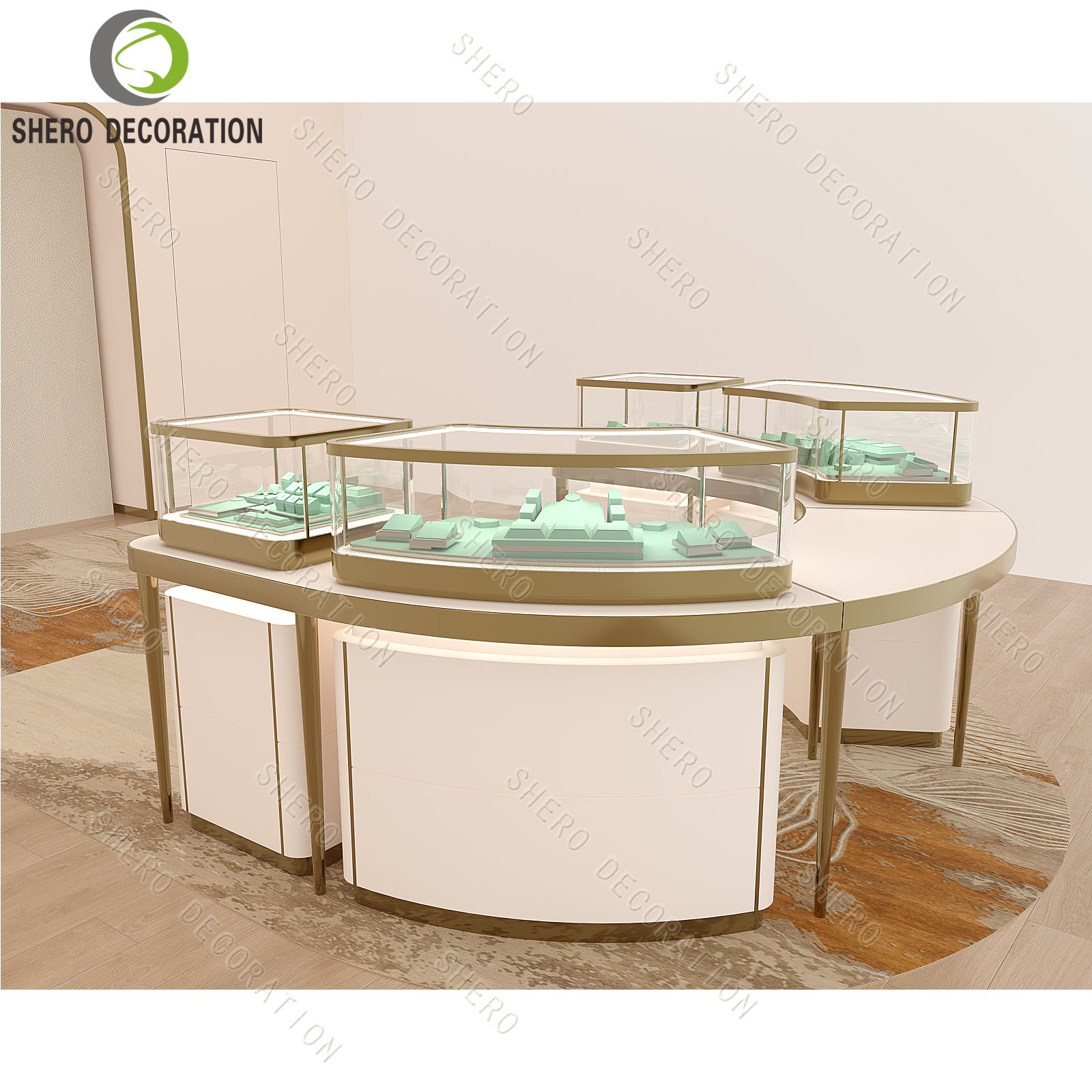 Shero is a leading glass showcases supplier. We customize design manufacturing based on high end quality material guarantee. Golden stainless steel, ultra clear tempered glass&bullet-proof safety glass, Ultra-bright Led Lights, E0 plywood, German famous brand lock&accessories, all those best materials are combined to create a unique charming retail space: A space that integrates both display function and aesthetic beauty. If you wanna customized display showcases or help with your shop 3D interior design, Feel Free To Contact Our Team!